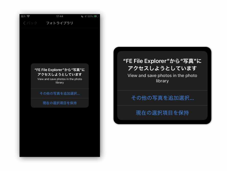 最初にフォトライブラリを使うとき、他のアプリと同じように "写真" へのアクセス許可を求められます。