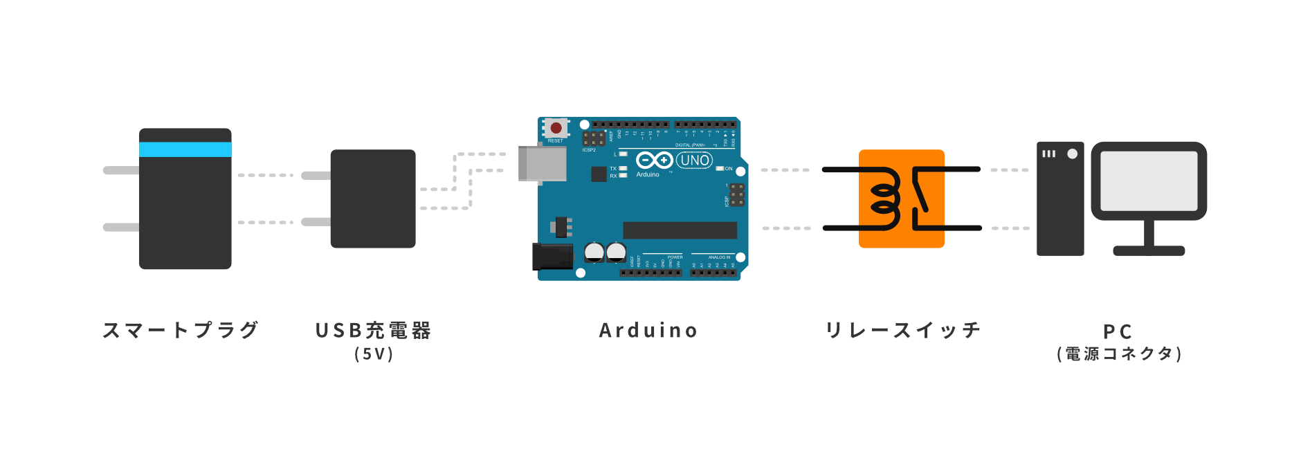 スマートプラグと PC を直接つなげるのではなく、 リレースイッチ を介して接続します。
