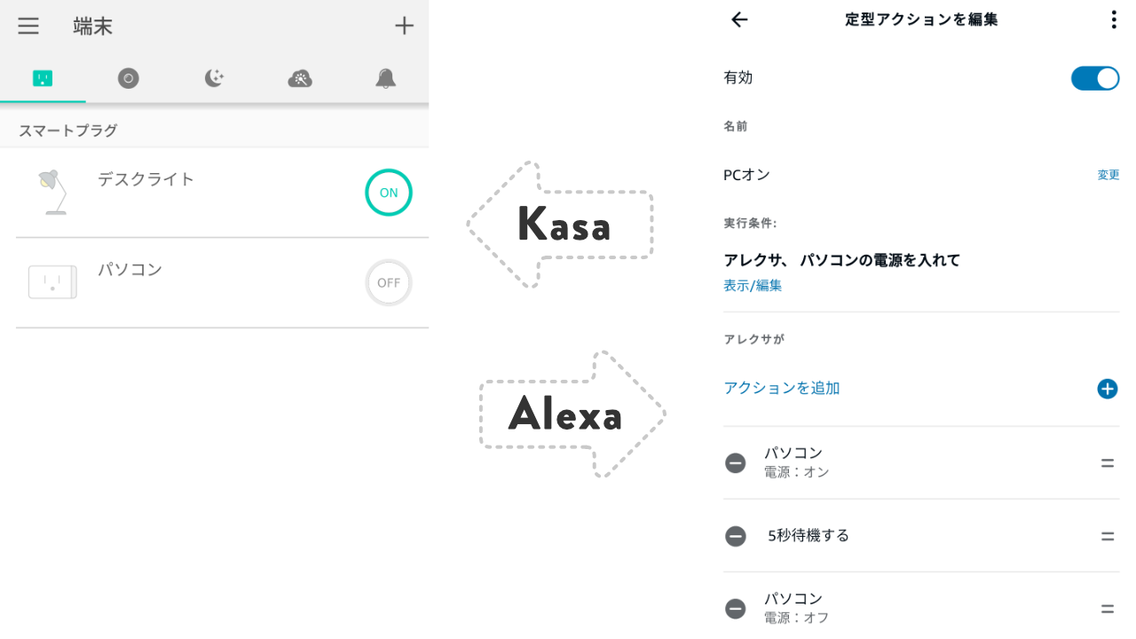 スマートプラグのメーカーが TP-Link だったので、Kasa アプリで初期設定を済ませ、Alexa の定型アクションで声でも操作できるようにしました。