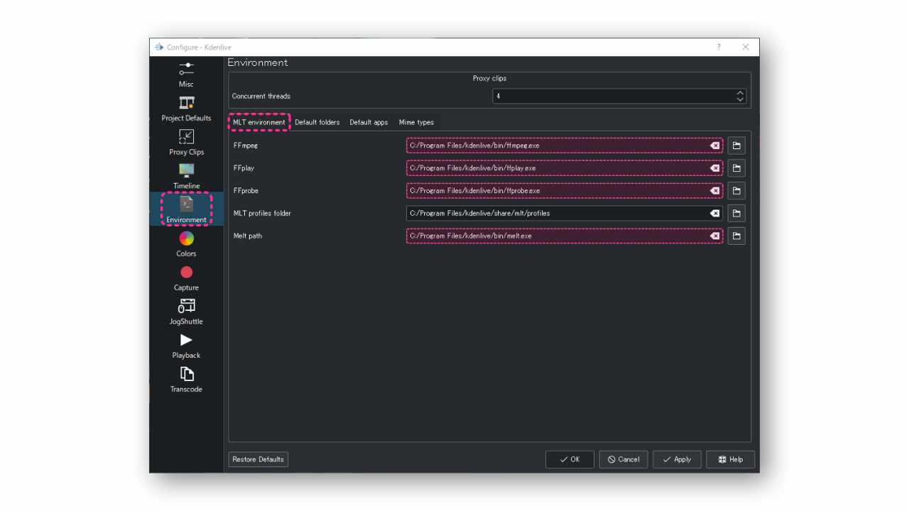 KdenliveのMLTffmpegのリンク先をshotcutのものに書き換えます。